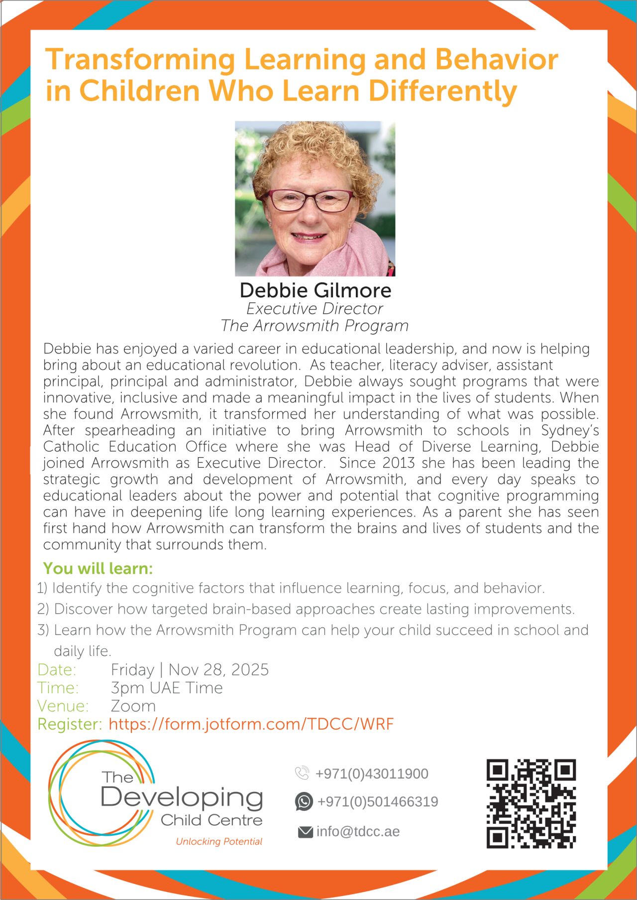 Join us for an exclusive Question and Answer session with Debbie Gilmore, Executive Director of Arrowsmith Program Worldwide and Rita Margarita, UAE and Europe Representative to learn how to empower your child's cognitive growth. Discover more about the incredible Arrowsmith Program!